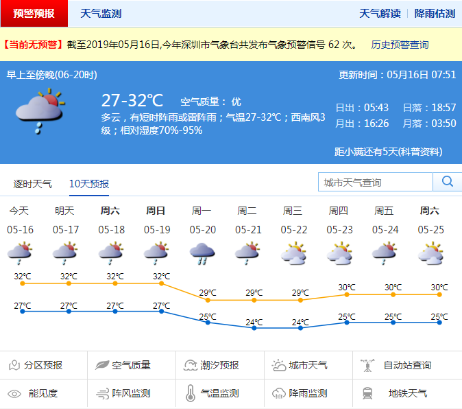 深圳新聞網(wǎng)2019年5月16日訊 本周深圳天氣持續(xù)炎熱,市民中心站最高氣溫甚至超過35℃。記者從市氣象局了解到,16日至19日天氣炎熱,最高氣溫達(dá)32℃,以多云為主,多局地性(雷)陣雨;19日夜間至20日有一次明顯降雨并伴有雷雨大風(fēng)。
