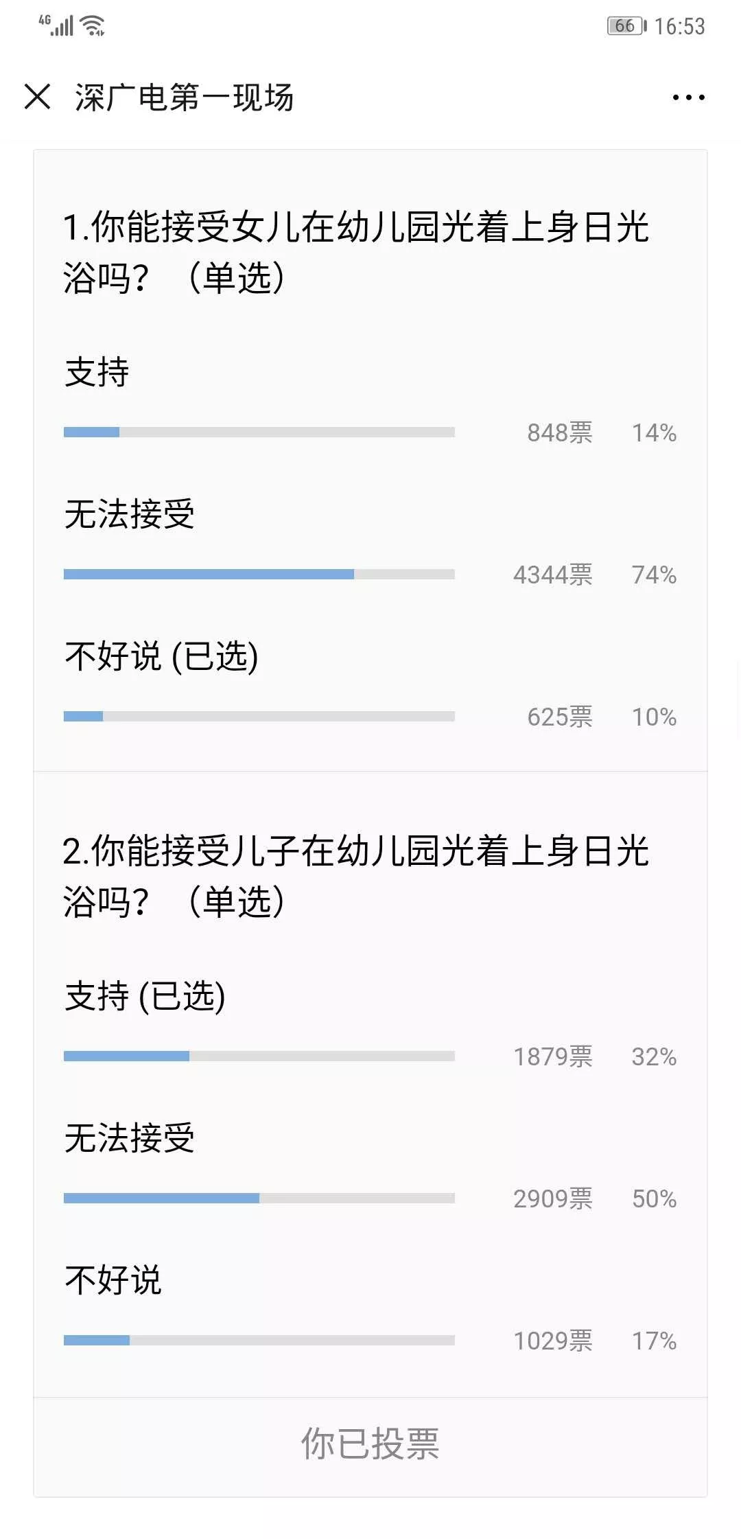 節(jié)目播出后,在第一現場微信公眾號上進行的話題投票中,有74%的觀眾都認為無法接受女兒在幼兒園光著上身日光浴,另外有50%的人認為無法接受兒子進行同樣的行為。