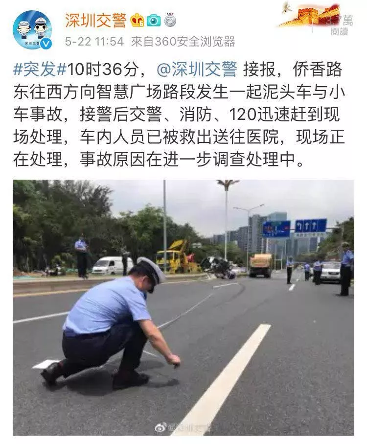據(jù)@深圳交警官方微博消息,10時36分,僑香路東往西方向智慧廣場路段發(fā)生一起泥頭車與小車事故,接警后交警、消防、120迅速趕到現(xiàn)場處理,車內(nèi)人員已被救出送往醫(yī)院,現(xiàn)場正在處理,事故原因在進一步調(diào)查處理中。