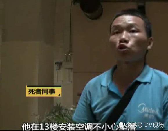 從拍攝的視頻可以看到,死者當(dāng)時(shí)是穿著有"美的公司"公司字樣的衣服,目擊者說(shuō),死者是在13樓安裝空調(diào)外機(jī)時(shí)出事的。