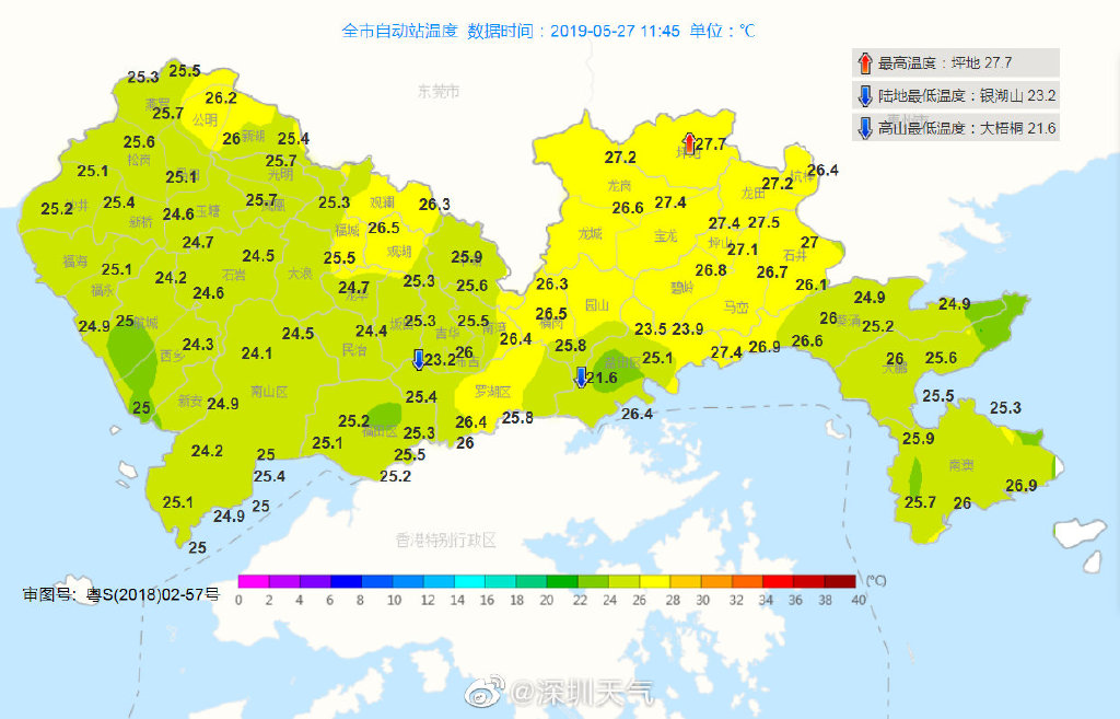 深圳市氣象臺于2019年05月27日09時15分將暴雨紅色和暴雨橙色分區(qū)預(yù)警降級為暴雨黃色預(yù)警,預(yù)計今天白天我市仍有雷雨,部分時間雨勢較大,全市暴雨黃色和雷電預(yù)警生效中,請繼續(xù)做好防御。