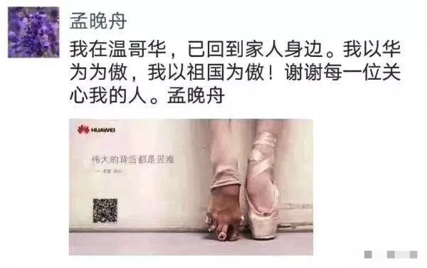 當?shù)貢r間2018年12月1日,加拿大當局應美方要求,扣留了在加拿大機場轉機的孟晚舟,美國隨后承認,正在尋求對孟晚舟的引渡。10天之后,2018年12月11日,加拿大法院作出裁決,批準孟晚舟的保釋申請。當晚,走出法庭的孟晚舟發(fā)朋友圈表示,我以華為為傲,我以祖國為傲。配圖就是那張“芭蕾腳”的華為廣告圖,上面寫著:偉大的背后都是苦難。外界擔心,由于不斷升級的中美貿易摩擦,可能會影響到孟晚舟在加拿大的引渡訴訟。