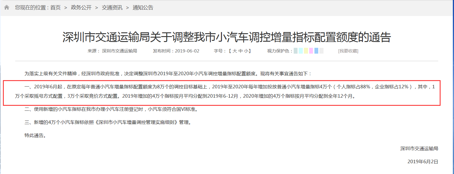 6月2日,深圳市交通運輸局發(fā)布了關于調整我市小汽車調控增量指標配置額度的通告