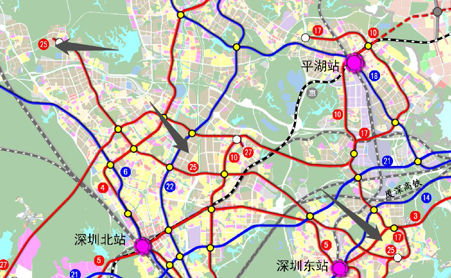 根據(jù)《深圳市城市軌道線網(wǎng)規(guī)劃(2016-2030)》,25號線定位為支撐深圳市北部發(fā)展帶的普速服務線。線路聯(lián)系龍華、坂田、布吉等橫向二圈層片區(qū),增加沿線片區(qū)的軌道覆蓋率,加強橫向聯(lián)系,同時與5條縱向軌道快、干線換乘,喂給客流,完善軌道線網(wǎng)結(jié)構(gòu)。