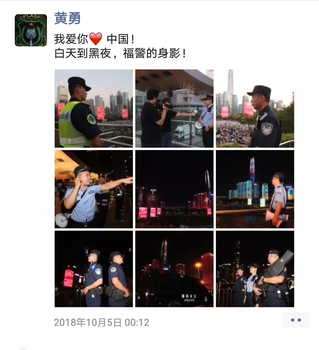 ▲福田派出所輔助人員朱峰朋友圈
