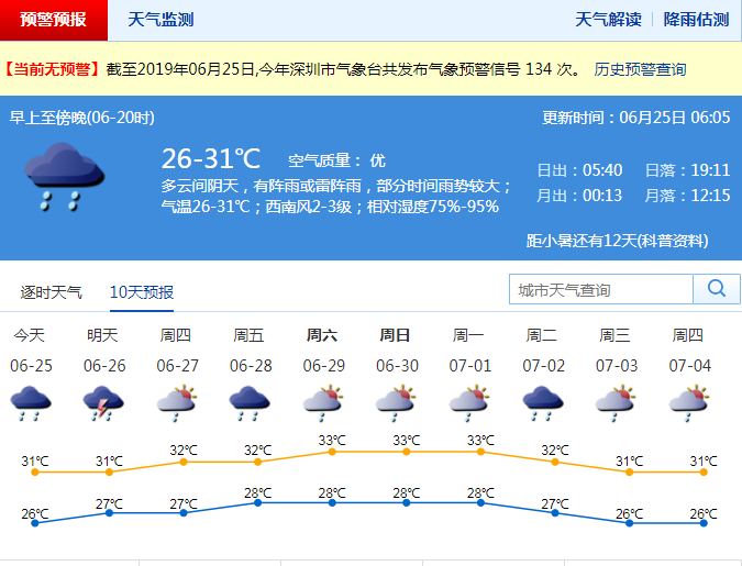 深圳新聞網(wǎng)2019年6月25日訊 昨日,深圳啟動(dòng)暴雨IV級(jí)應(yīng)急響應(yīng),全市普遍出現(xiàn)大雨,局部暴雨,最高氣溫26℃左右,高溫天氣緩解。市氣象臺(tái)預(yù)測(cè),未來兩天風(fēng)力清勁,多陣雨,局部大雨。