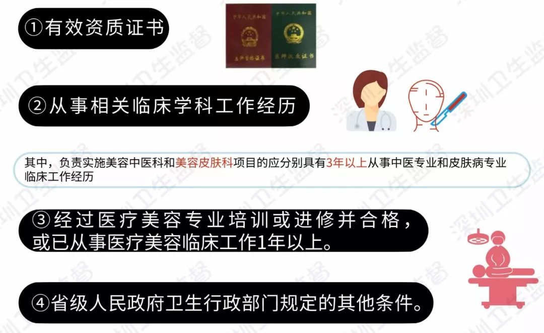 (二)具有從事相關臨床學科工作經(jīng)歷。其中,負責實施美容外科項目的應具有6年以上從事美容外科或整形外科等相關專業(yè)臨床工作經(jīng)歷;負責實施美容牙科項目的應具有5年以上從事美容牙科或口腔科專業(yè)臨床工作經(jīng)歷;負責實施美容中醫(yī)科和美容皮膚科項目的應分別具有3年以上從事中醫(yī)專業(yè)和皮膚病專業(yè)臨床工作經(jīng)歷;(三)經(jīng)過醫(yī)療美容專業(yè)培訓或進修并合格,或已從事醫(yī)療美容臨床工作1年以上;(四)省級人民政府衛(wèi)生行政部門規(guī)定的其他條件。