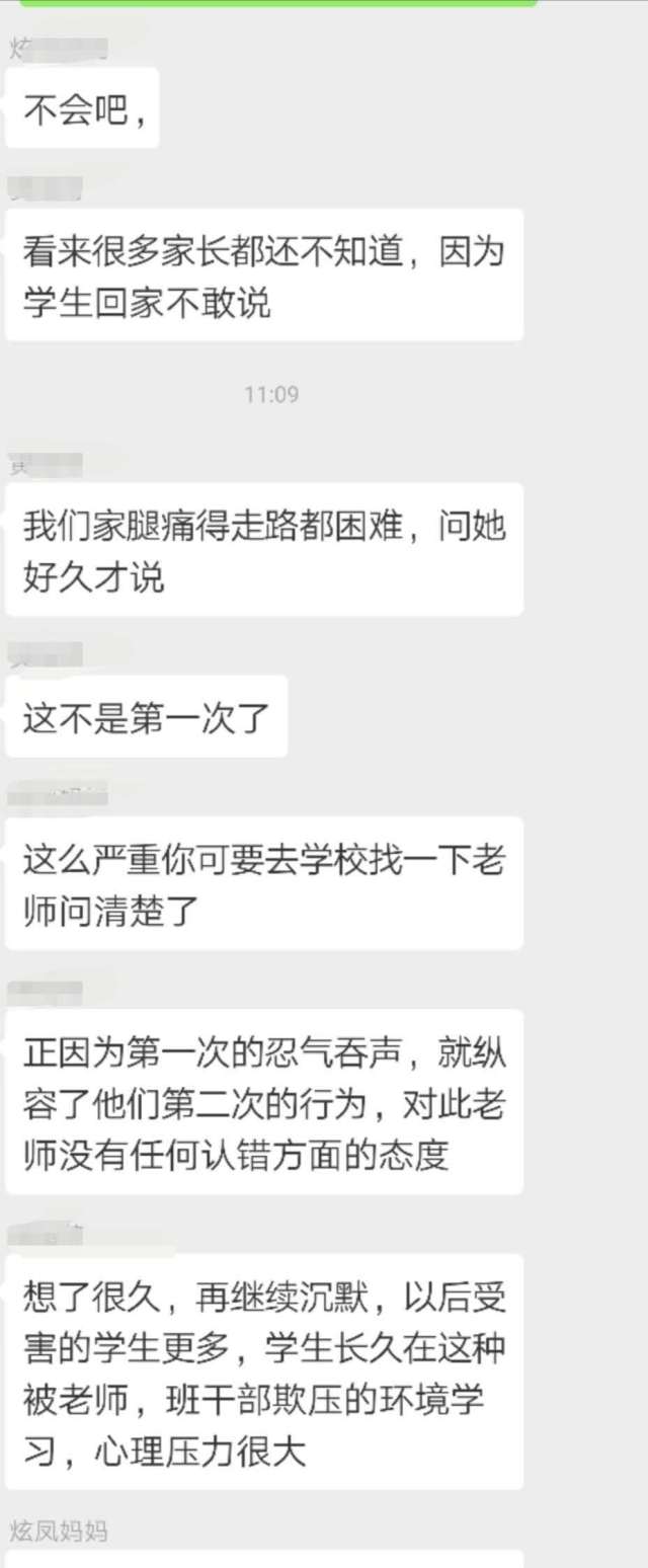 王先生把女兒的情況反映到家長群里,結(jié)果群里的家長紛紛表示,自己的孩子也反映當(dāng)天遭遇到班長的毆打,有的孩子甚至“腿疼得難以走路”。