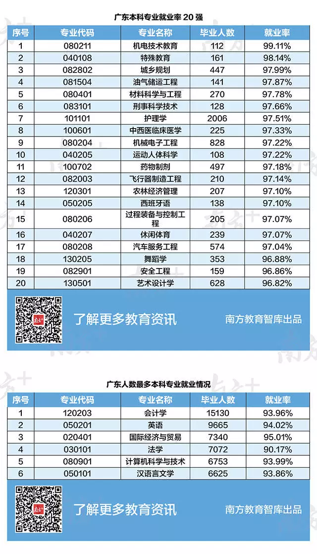 2018年廣東本科畢業(yè)生初次就業(yè)率為93.84%。就業(yè)率最高前20名中,屬工科類的專業(yè)最多,有10個(gè)。