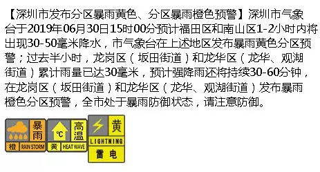 于14時40分起先后在寶安區(qū)、龍華區(qū)、南山區(qū)、福田區(qū)和龍崗區(qū)(南灣、坂田、平湖、布吉、吉華街道)發(fā)布暴雨黃色預(yù)警,在龍崗區(qū)(坂田街道)和龍華區(qū)(龍華、觀湖街道)將暴雨黃色升級為暴雨橙色預(yù)警。