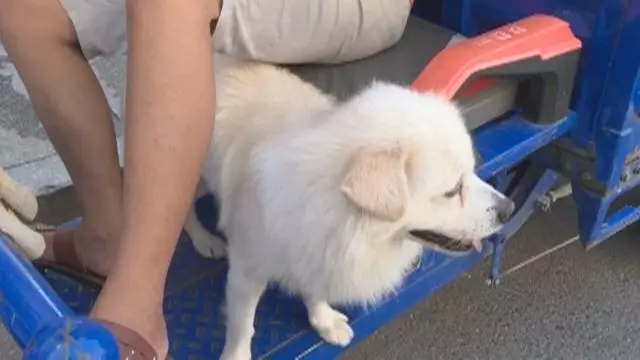 而是讓狗蹲在三輪車(chē)駕駛座下方