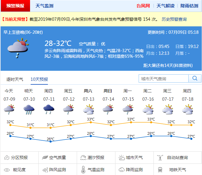 深圳新聞網(wǎng)2019年7月9日訊 近幾天,深圳天氣炎熱,有短時(shí)陣雨,白天最高氣溫達(dá)到31~33 ℃。預(yù)計(jì)9日有陣雨或雷陣雨,10~11日將有一次中到大雨局部暴雨過(guò)程,伴有雷暴和7~8級(jí)短時(shí)大風(fēng),炎熱天氣將有所緩解。