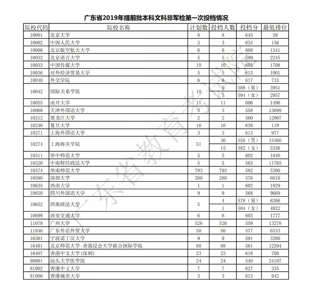 廣東省2019年提前批本科非軍檢第一次投檔情況出來啦!投檔情況如下: