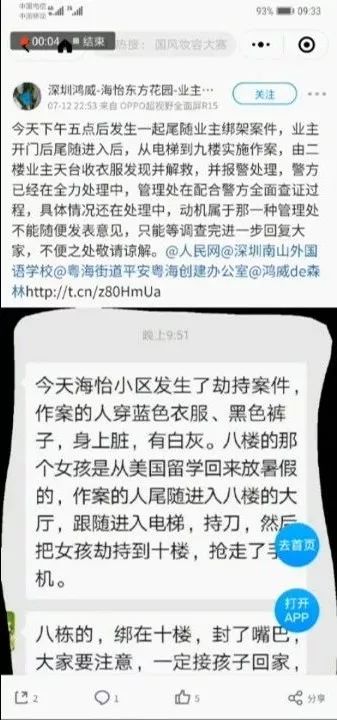 帖子下方跟著很多聊天截圖,透露被尾隨的業(yè)主是個(gè)年輕女孩,“嫌疑人持刀把女孩劫持到十樓,搶走手機(jī)”,女孩被“封住嘴巴”,還說“嫌疑人在小區(qū)內(nèi)轉(zhuǎn)了很久尋找目標(biāo)”。記者今天中午來到位于南山科技園南區(qū)的涉事小區(qū),業(yè)主們說這事讓他們很震驚。