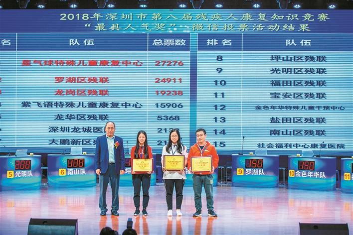 ▲2018深圳市第八屆殘疾人康復(fù)知識競賽,王堅為獲獎單位代表頒獎。
