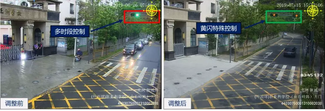 龍崗怡翠/新亞洲學(xué)校路口行人過街需求主要集中于上下學(xué)期間,近期暑期開始,行人過街需求小,路口調(diào)整至全天黃閃控制模式,以提高機(jī)動(dòng)車通行效率。