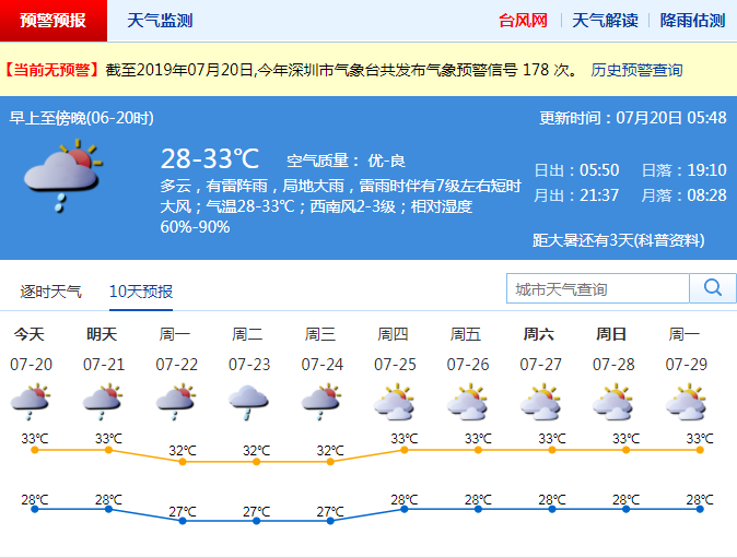 深圳新聞網(wǎng)2019年7月20日訊 昨日午后,我市出現(xiàn)中到大雨局部暴雨,并出現(xiàn)8-9級(jí)的短時(shí)大風(fēng)。深圳市氣象臺(tái)先后發(fā)布雷電、大風(fēng)藍(lán)色、暴雨黃色和分區(qū)暴雨橙色預(yù)警信號(hào)。這場(chǎng)雨帶來的降溫效果明顯,持續(xù)多日的高溫緩解,預(yù)警解除。
