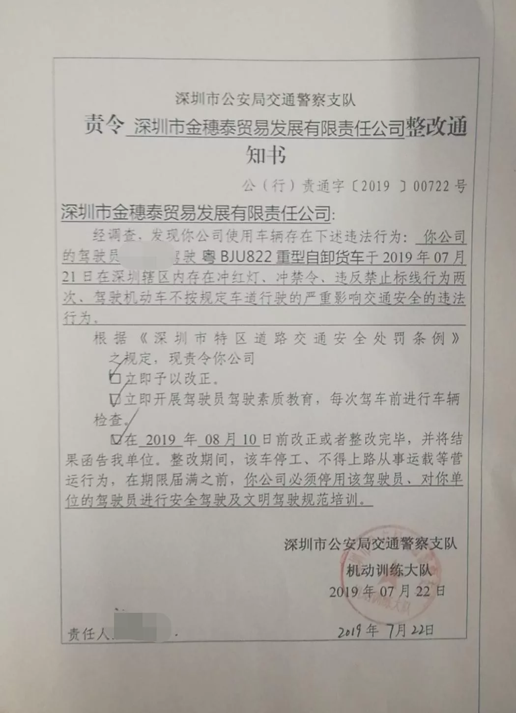接到舉報(bào)后,深圳交警立即展開調(diào)查。經(jīng)查,被舉報(bào)的泥頭車所屬企業(yè)為深圳市金穗泰貿(mào)易發(fā)展有限責(zé)任公司,當(dāng)事駕駛員為劉某軍。隨后,深圳交警立即通知駕駛員及企業(yè)相關(guān)責(zé)任人前來交警隊(duì)配合接受調(diào)查。