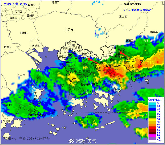 當(dāng)一條雨帶的長軸和雨帶的移動方向(箭頭)夾角很小時,某個地方就會被這條雨帶幾乎從頭到尾地經(jīng)過,于是這個地方的累計雨量就會特別大。而現(xiàn)在深圳靠南的大部分區(qū)域就在經(jīng)歷一場列車效應(yīng),所以這場雨持續(xù)時間比較長,短時間內(nèi)停不下來。