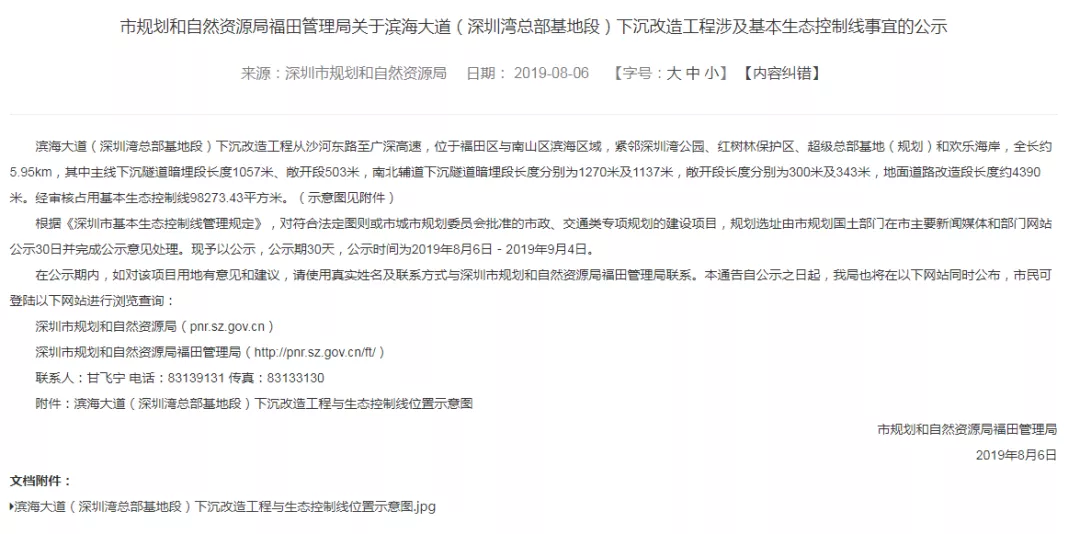 目前濱海大道(深圳灣總部基地段)下沉改造工程正公示中,公示期至9月4日