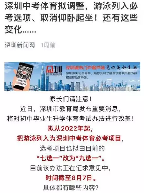 調(diào)整后,深圳體育中考分?jǐn)?shù)由統(tǒng)一現(xiàn)場(chǎng)考試成績分值32分、過程性考核(平時(shí)成績)分值12分和《國家學(xué)生體質(zhì)健康標(biāo)準(zhǔn)》測(cè)試分值6分組成,滿分為50分。其中,體育考試考試項(xiàng)目仍為“1+1”,即考生參加1項(xiàng)必考科目和1項(xiàng)選考項(xiàng)目。必考科目由現(xiàn)在的200米跑和中長跑(800米[女]和1000米[男])任選其一調(diào)整為中長跑(800米[女]和1000米[男])或100米游泳任選其一。