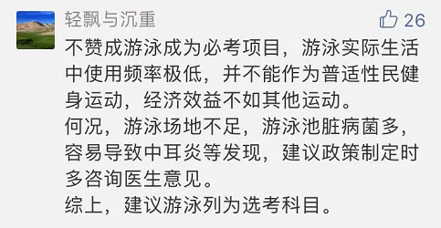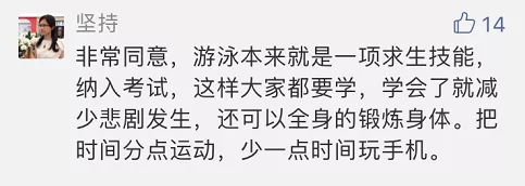 對(duì)于游泳納入中考體育必考選項(xiàng),家長(zhǎng)們的看法不一。支持者認(rèn)為,“游泳本來(lái)就是一項(xiàng)求生技能,納入考試,孩子們都要學(xué)習(xí),除了鍛煉身體,還能減少意外的發(fā)生?!币灿腥苏J(rèn)為“很多學(xué)校都沒(méi)有開(kāi)設(shè)游泳課,學(xué)習(xí)硬件設(shè)施跟不上也白搭?!狈磳?duì)者則認(rèn)為,“游泳實(shí)際生活中使用頻率極低,并不能作為普適性健身運(yùn)動(dòng),納入選考更合適”“學(xué)校的硬件設(shè)施跟不上,課外游泳培訓(xùn)費(fèi)傷不起?!?/p>