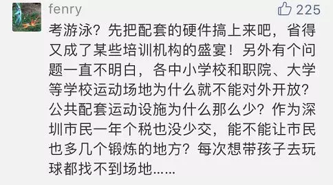 在留言中,多數(shù)家長(zhǎng)表示,如果確定將游泳納入中考體育必考選項(xiàng),希望學(xué)校體育教學(xué)也能進(jìn)行相關(guān)配套。而小編了解到解到,目前深圳小學(xué)、初中學(xué)校開(kāi)設(shè)游泳課最大的難點(diǎn)在于場(chǎng)地。