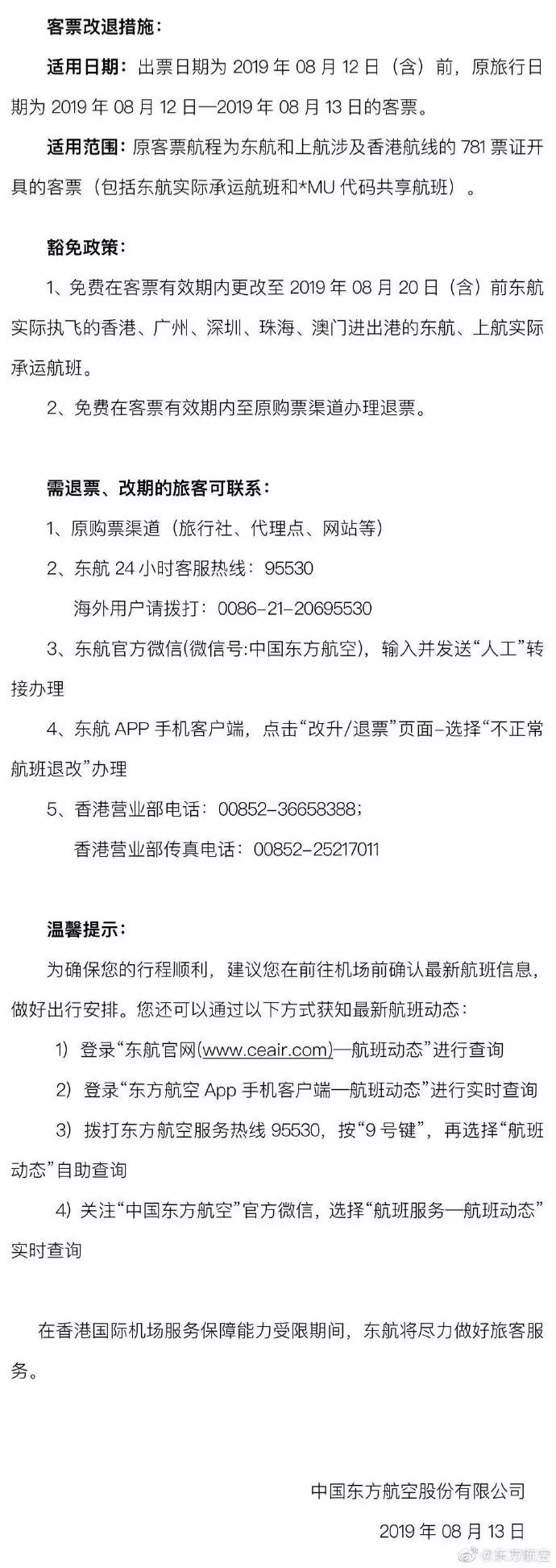 南方航空公司在公告中說明,所持客票為南航784票證,出票日期為2019年8月12日(含)前,旅行日期為2019年8月12日(含)至2019年8月18日(含),客票航程中包含中國內(nèi)地與香港之間南航航段(包括南航實際承運航段及代碼共享航段)的乘客,可對客票未使用部分,在客票有效期內(nèi)免除退票費進(jìn)行退票(包括原客票規(guī)則不允許退票的客票);或者免費變更一次至8月25日(含)前的南航實際承運的香港、廣州、深圳、珠海進(jìn)出港航班,允許變更航程,不收取票價和稅費差額。變更至8月26日(含)后的航班,按照自愿變更處理。