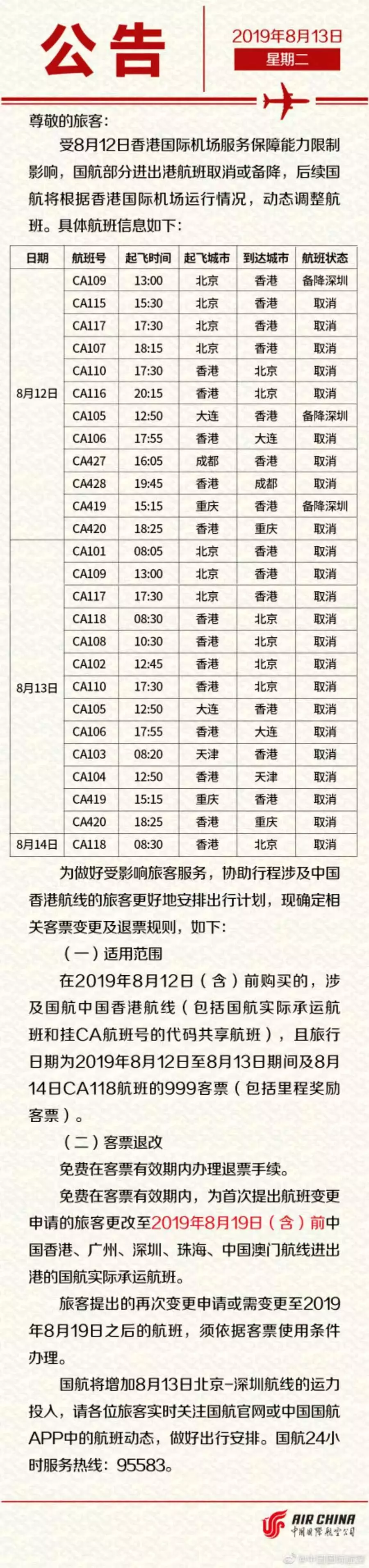 今晨,中國國際航空公司官方微博發(fā)布公告稱,受8月12日香港國際機(jī)場服務(wù)保障能力限制影響,國航部分進(jìn)出港航班取消或備降,后續(xù)國航將動態(tài)調(diào)整航班。