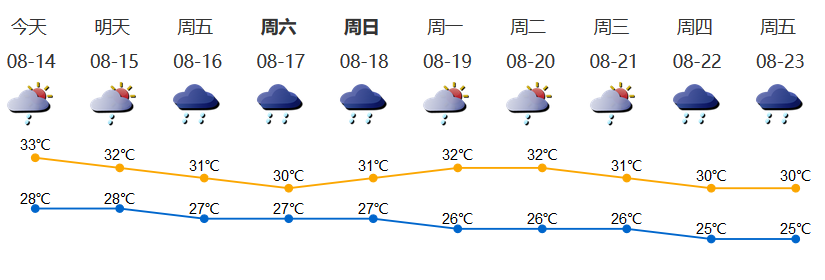 我市今天多云,有短時(shí)陣雨或雷陣雨;氣溫28-33℃;西南風(fēng)2-3級(jí);相對(duì)濕度70%-90%。