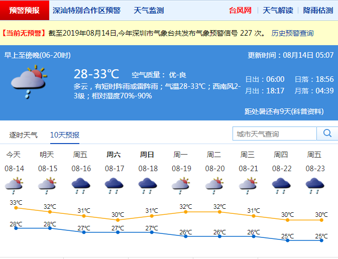深圳今日最高氣溫33℃,有短時雷陣雨 請注意帶傘并防暑降溫