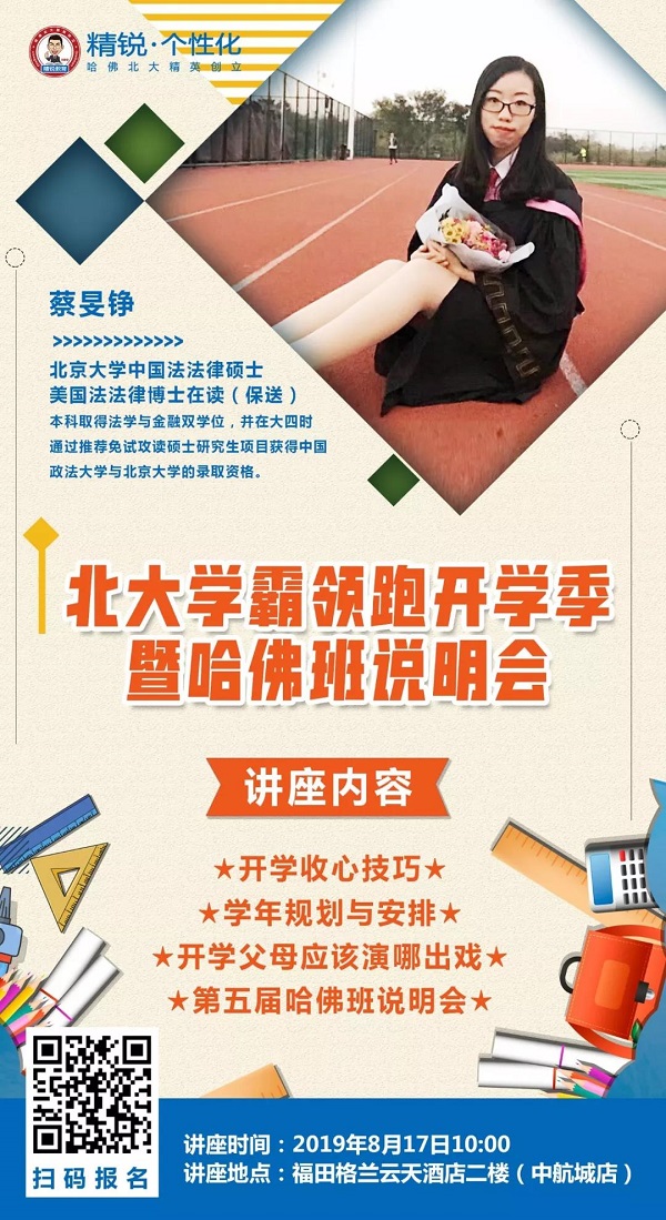 為了幫助深圳的孩子擺脫假期綜合征,快速適應(yīng)新年級(jí)帶來的變化,《北大學(xué)霸領(lǐng)跑開學(xué)季》公益講座特別邀請(qǐng)到北大學(xué)霸蔡旻錚學(xué)姐于本周六和深圳的家長、學(xué)生分享開學(xué)收心技巧,如何做好學(xué)年規(guī)劃與安排。