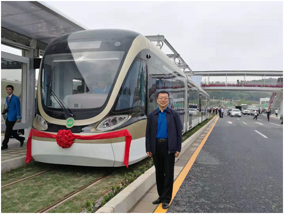 深圳龍華現(xiàn)代有軌電車開通現(xiàn)場,簡煉與電容供電無接觸網(wǎng)的有軌電車合影。