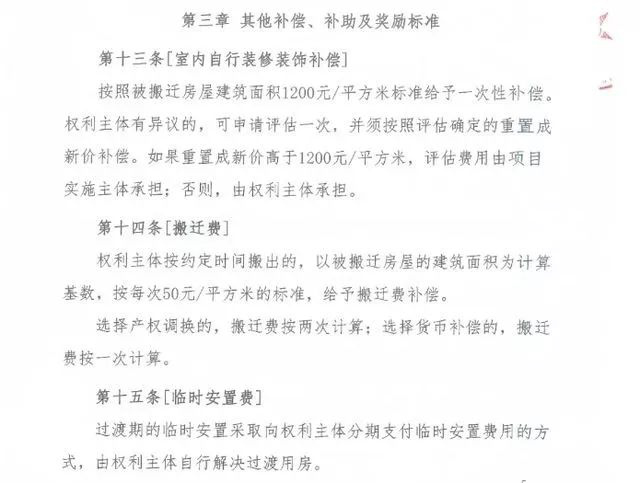 此外,室內(nèi)自行裝修裝飾補(bǔ)償標(biāo)準(zhǔn),將按照被搬遷房屋建筑面積1200元 /平方米標(biāo)準(zhǔn)給予一次性補(bǔ)償。搬遷費(fèi)以被搬遷房屋的建筑面積為計(jì)算基數(shù),按每次50元 /平方米的標(biāo)準(zhǔn),給予搬遷費(fèi)補(bǔ)償。