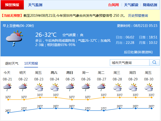 見(jiàn)圳客戶端·深圳新聞網(wǎng)2019年8月21日訊(見(jiàn)圳客戶端·深圳新聞網(wǎng)記者 高暢韻)記者從市氣象局了解到,昨日我市白天最高氣溫31 ℃ -33 ℃,中北部最高氣溫達(dá)到35 ℃。今日多云,有(雷)陣雨;22-24日多云間晴天,局部有短時(shí)(雷)陣雨,部分地區(qū)最高氣溫可達(dá)35 ℃左右;25-26日有(雷)陣雨,氣溫有所回落。