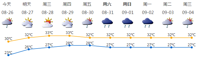 我市大雨轉(zhuǎn)陣雨;氣溫23-30℃;西南風(fēng)3級(jí);相對(duì)濕度65%-95%。