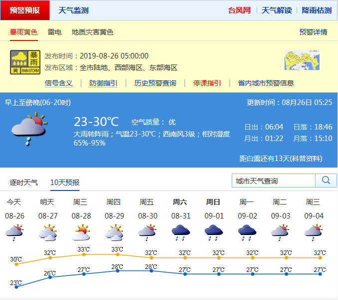 見圳客戶端·深圳新聞網(wǎng)2019年8月26日訊 今年第11號臺風“白鹿”已經(jīng)于昨日7時25分在福建省東山縣沿海登陸后,已減弱為熱帶低壓,向西偏北方向移動,市氣象臺已于昨日17時取消臺風白色預警信號。據(jù)市氣象局預計,今日白天大雨轉(zhuǎn)陣雨,降雨減弱;27-29日多云間晴天,天氣趨于悶熱。