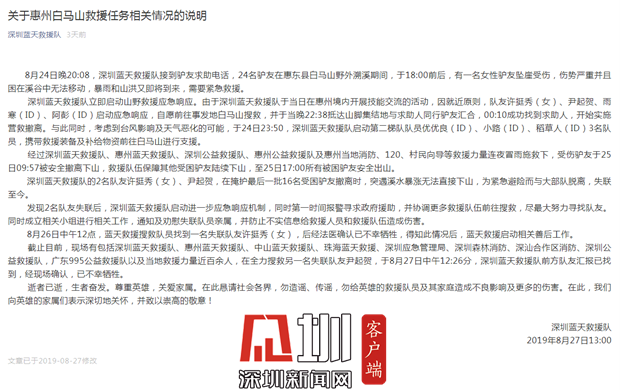 見圳客戶端?深圳新聞網(wǎng)2019年8月30日訊(見圳客戶端、深圳新聞網(wǎng)記者 張玲)8月27日下午,深圳藍(lán)天救援隊(duì)發(fā)布消息稱:8月25日,救援隊(duì)兩名隊(duì)友在掩護(hù)最后一批受困驢友撤離時(shí),突遇溪水暴漲無法直接下山,為緊急避險(xiǎn)而與大部隊(duì)脫離失聯(lián)。8月27日中午,最終將兩名隊(duì)友找回,經(jīng)確認(rèn),兩名隊(duì)員許挺秀(女)、尹起賀已不幸犧牲。