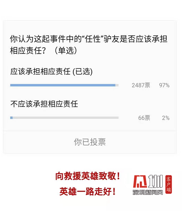有一個(gè)細(xì)節(jié)是,這批受困的驢友上山溯溪的時(shí)間正是深圳發(fā)布臺風(fēng)預(yù)警信號的時(shí)間,因此很多人也認(rèn)為在臺風(fēng)天探險(xiǎn),驢友過于任性。在深圳新聞網(wǎng)微信公眾號發(fā)起的小調(diào)查(你認(rèn)為這起事件中的“任性”驢友是否應(yīng)該承擔(dān)相應(yīng)責(zé)任?(單選))中,共有2553名網(wǎng)友作答,97%的人認(rèn)為應(yīng)該承擔(dān)相應(yīng)責(zé)任。