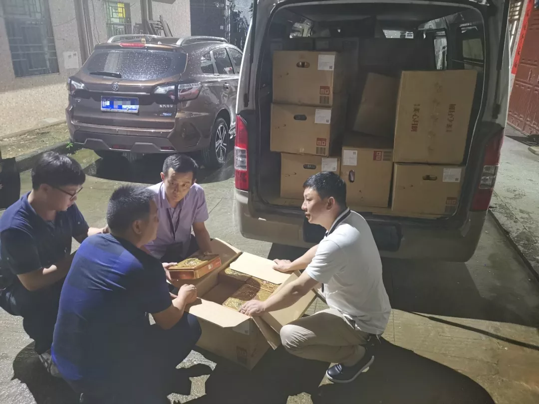 執(zhí)法人員在嫌疑人住所外清點(diǎn)、扣押涉案的月餅