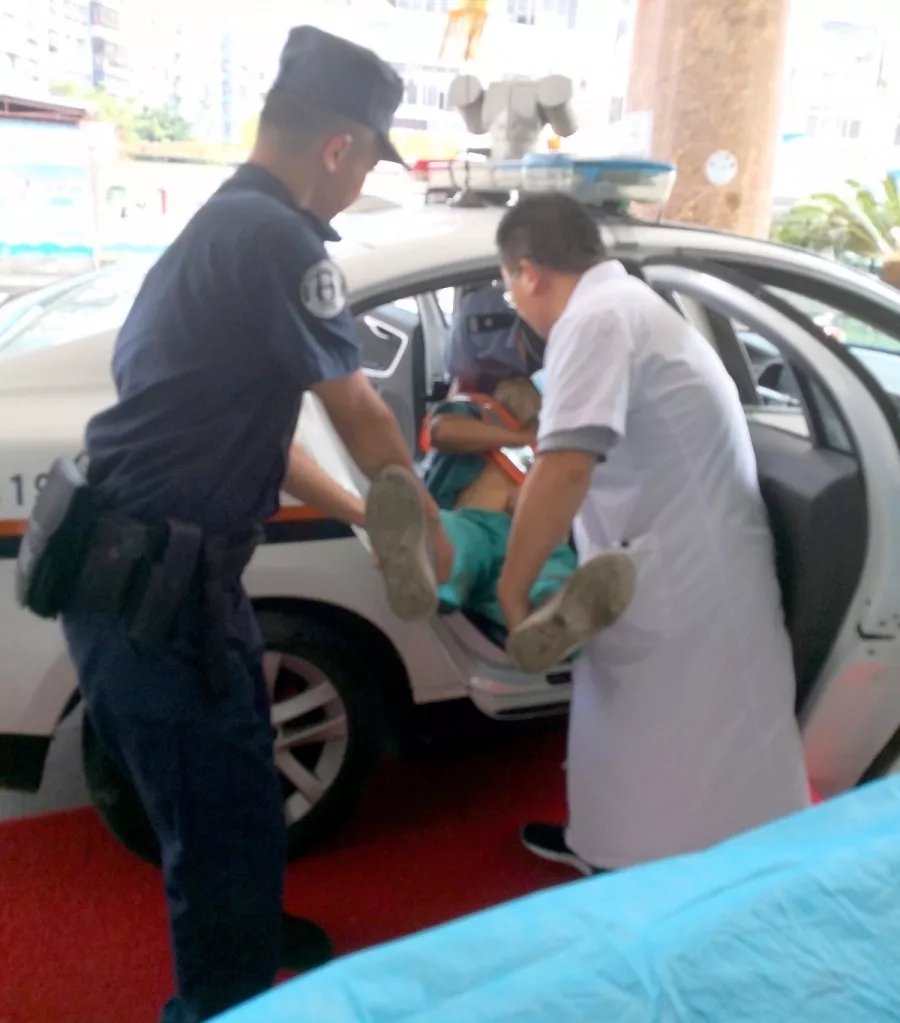 羅明星和交警隊(duì)員還有一名熱心群眾一起把這名環(huán)衛(wèi)工人抬上了警車(chē)。憑借著對(duì)轄區(qū)的了解,羅明星很快將他送到了最近的仁愛(ài)醫(yī)院。