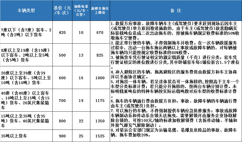 廣東省高速公路拖車服務(wù)收費標準見下表: