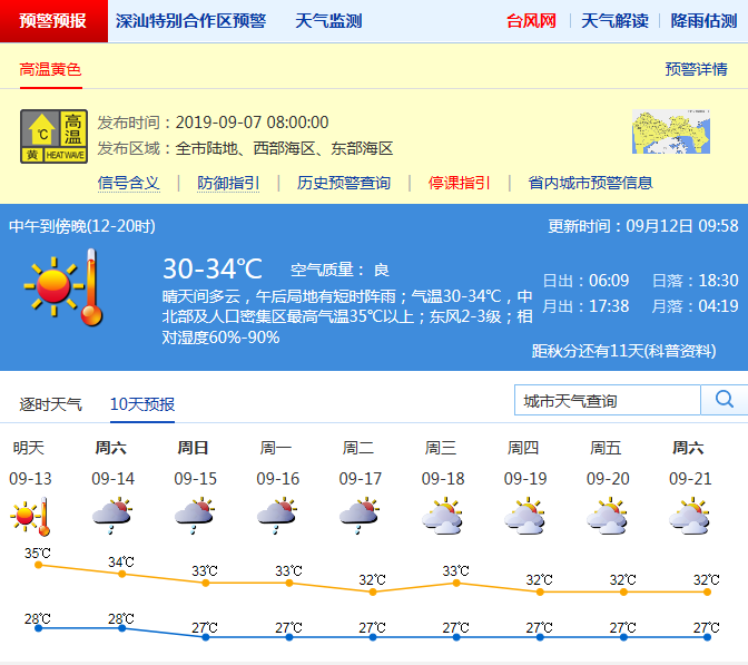 見圳客戶端·深圳新聞網(wǎng)2019年9月12日訊 深圳氣象局預(yù)計12日晴天間多云,天氣炎熱,局部有短時雷陣雨;氣溫28-34℃,中北部或人口密集區(qū)最高氣溫35℃以上;東風(fēng)2-3級;相對濕度60%-90%。13日晴到多云,局部有短時雷雨;14-17日多云,有雷陣雨,高溫天氣逐漸緩解。