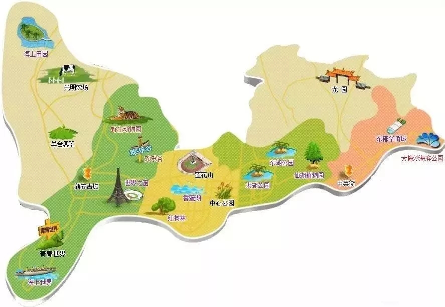大小梅沙、大鵬片區(qū)、東部華僑城、寶安鳳凰山、仙湖植物園、紅樹林、世界之窗、蓮花山、東湖公園、福田農批市場