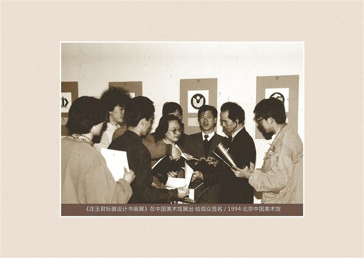 ▲1994年,《莊玉君標(biāo)徽設(shè)計(jì)書畫展》在中國(guó)美術(shù)館展出,莊玉君在現(xiàn)場(chǎng)給觀眾簽名。