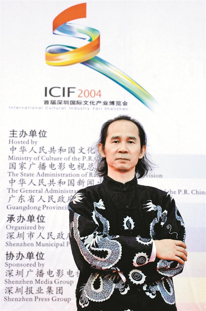 ▲2004年,莊玉君和他設(shè)計(jì)的文博會(huì)會(huì)徽“七彩文”。
