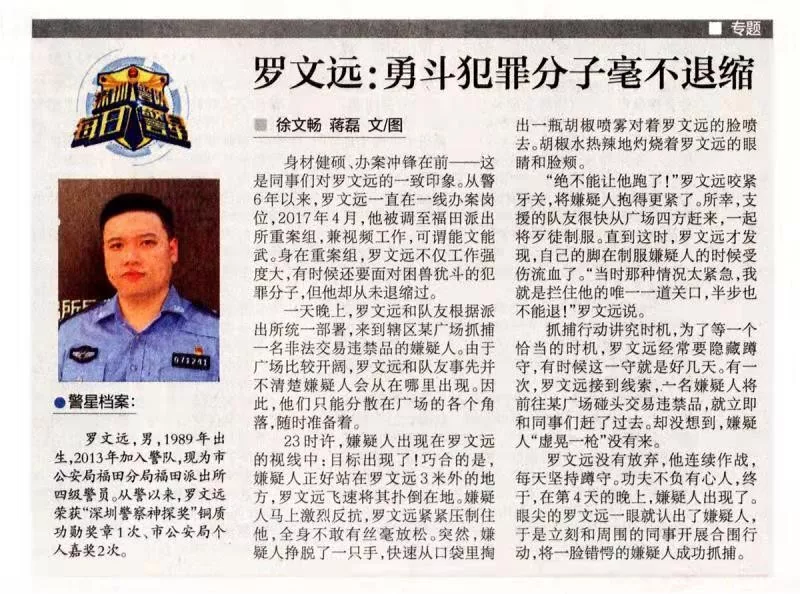 羅文遠(yuǎn),男,1989年出生,2013年加入警隊,現(xiàn)為深圳市公安局福田分局福田派出所四級警員。從警以來,羅文遠(yuǎn)榮獲“深圳警察神探獎”銅質(zhì)功勛獎?wù)?次、市公安局個人嘉獎2次。