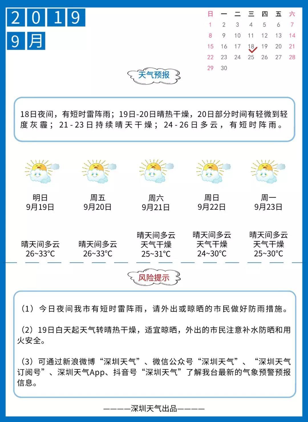 預(yù)計(jì)18日夜間有短時(shí)雷陣雨,19-20日天氣晴熱干燥,氣溫在26-33℃,20日部分時(shí)間有輕微到輕度灰霾,21-23日持續(xù)晴天干燥,24-26日多云,有短時(shí)陣雨。深圳天氣提醒市民,今夜外出注意防范局地短時(shí)雷雨,明日起外出注意補(bǔ)水防曬和用火安全!