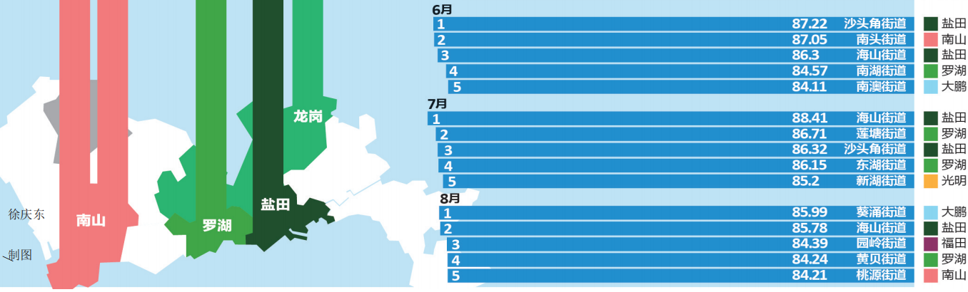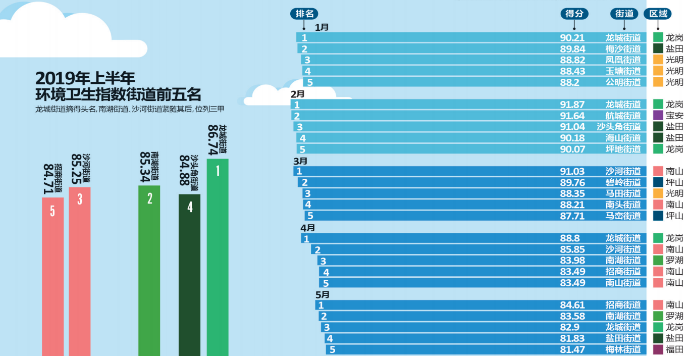 推進環(huán)境質(zhì)量邁進國際一流,深圳一直在行動。細心的市民可能早已發(fā)現(xiàn),深圳市城市管理和綜合執(zhí)法局官方網(wǎng)站每個月都會發(fā)布“深圳市環(huán)境衛(wèi)生指數(shù)排行榜”,為深圳的環(huán)境衛(wèi)生“打分”。據(jù)了解,深圳市環(huán)境衛(wèi)生指數(shù)測評排名已連續(xù)開展了兩年半,有效促進了全市環(huán)境衛(wèi)生的提升和轉變。今年上半年的“成績單”顯示,全市各區(qū)(新區(qū))各街道你追我趕,測評工作帶動社區(qū)環(huán)境改善,環(huán)境衛(wèi)生的整治提升得到了市民的廣泛認可和好評。