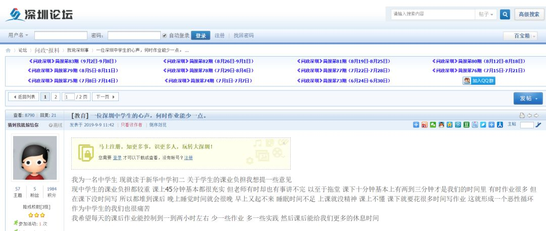 新華中學初二學生在深圳論壇對課業(yè)負擔提了一些意見,具體內容為:該中學生的課業(yè)負擔較重,導致睡眠時間不足、上課效率低。希望減負,有充足的休息時間。